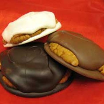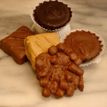 Homemade caramel, nuts and chocolate: Pecan, Almond, Macadamia, and Walnut, offered in Milk, White or Dark Chocolate.